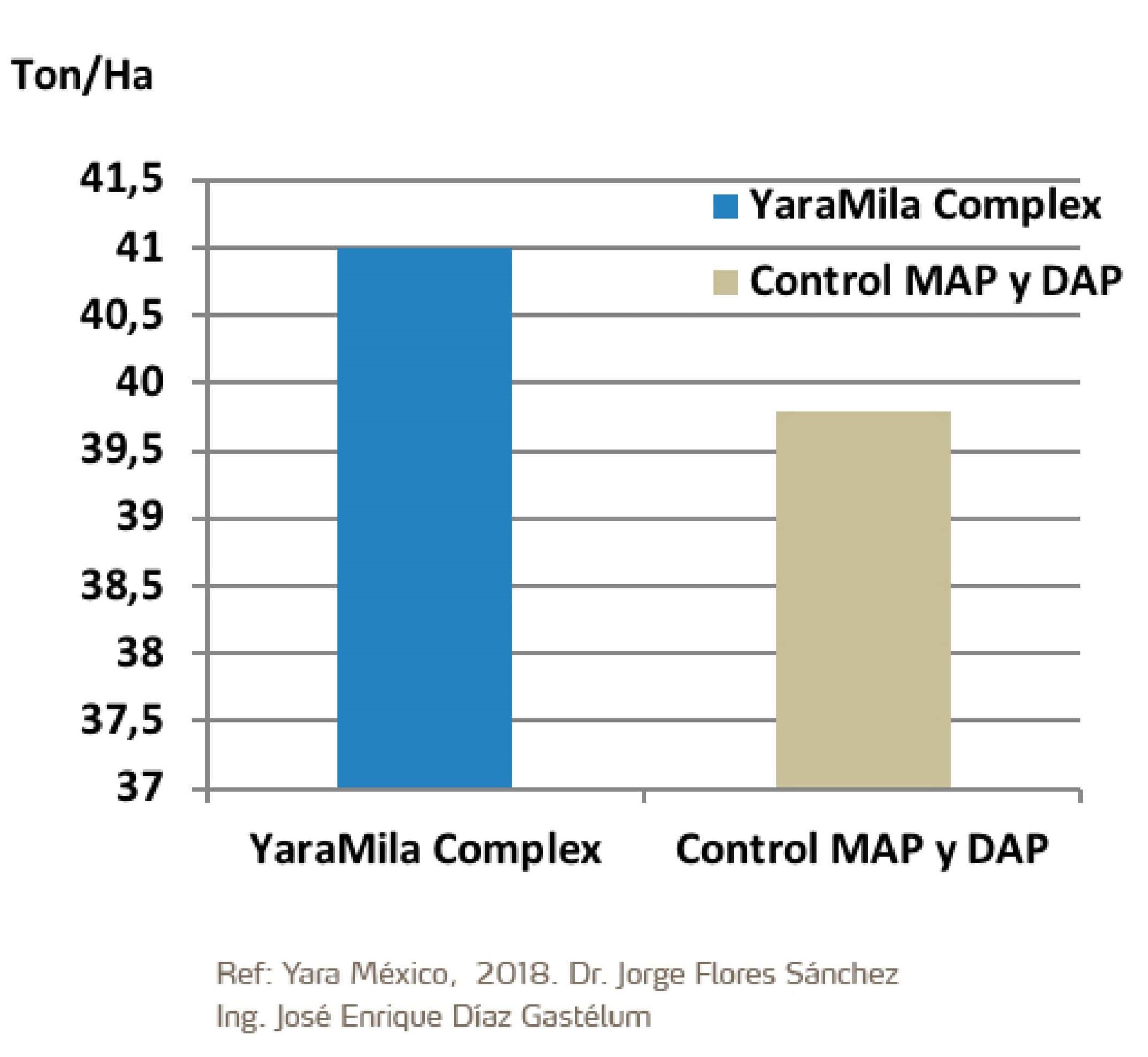 Los tratamientos de Yara recibieron entre 19-28% menos unidades de fósforo, pero los ensayos demostraron en forma consistente que YaraMila Complex tiene mayor efectividad al incrementar el rendimiento de papa hasta 1.2 Ton/Ha.