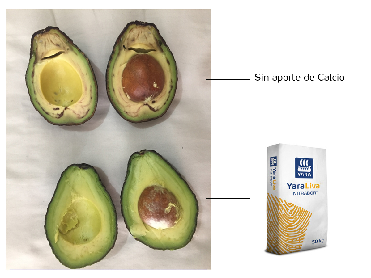 En la siguiente imagen podemos observar la comparación entre dos aguacates, 12 días después de corte, sin refrigeración. La fruta fue cortada en condiciones iguales en octubre del 2017 (con 22% de materia seca) y de una misma huerta (en Uruapan, México); lo único que varía es que a un aguacate se le aportó calcio, y al otro no. La diferencia entre ambos es clara: un aporte oportuno de calcio nos da como resultado mayor vida de anaquel y mayor calidad.
