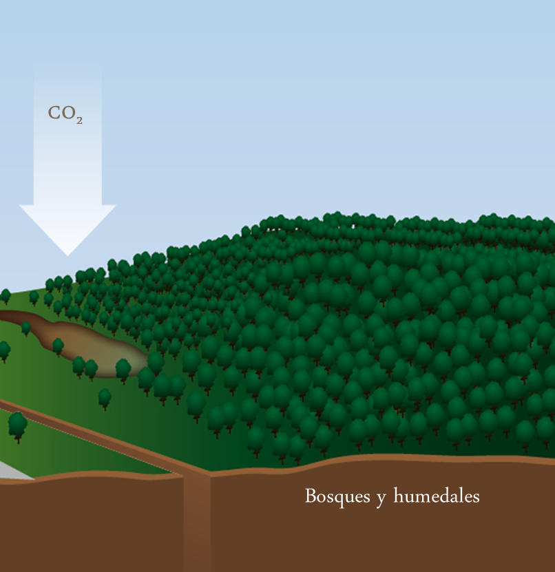 Bosques y humedales almacenan 2 a 8 veces más CO2 que tierra cultivada. El cambio de uso de suelos, principalmente por la quema de bosques tropicales, es una fuente muy grande de emisiones de CO2, y es responsable por 20% de las emisiones de CO2 de origen humano. Preservar los bosques tropicales y boreales es la contribución más importante para poder mitigar los cambios climáticos.