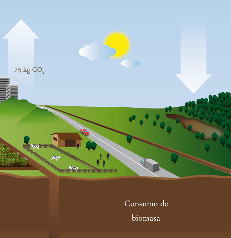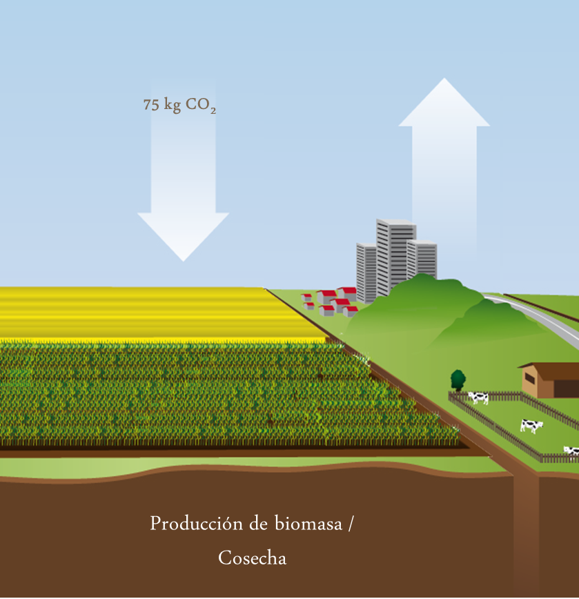 La mayor parte de la biomasa producida se consume como alimentos para humanos y animales. La fijación de CO2 es por eso solo a corto plazo y no puede considerarse un ahorro a nivel global. El equilibrio es diferente para bio-energía porque ayuda en disminuir el consumo de combustibles fósiles. Por ejemplo: Usando biomasa en vez de petróleo para calefacción reduce las emisiones de CO2 hasta 70 - 80%.
