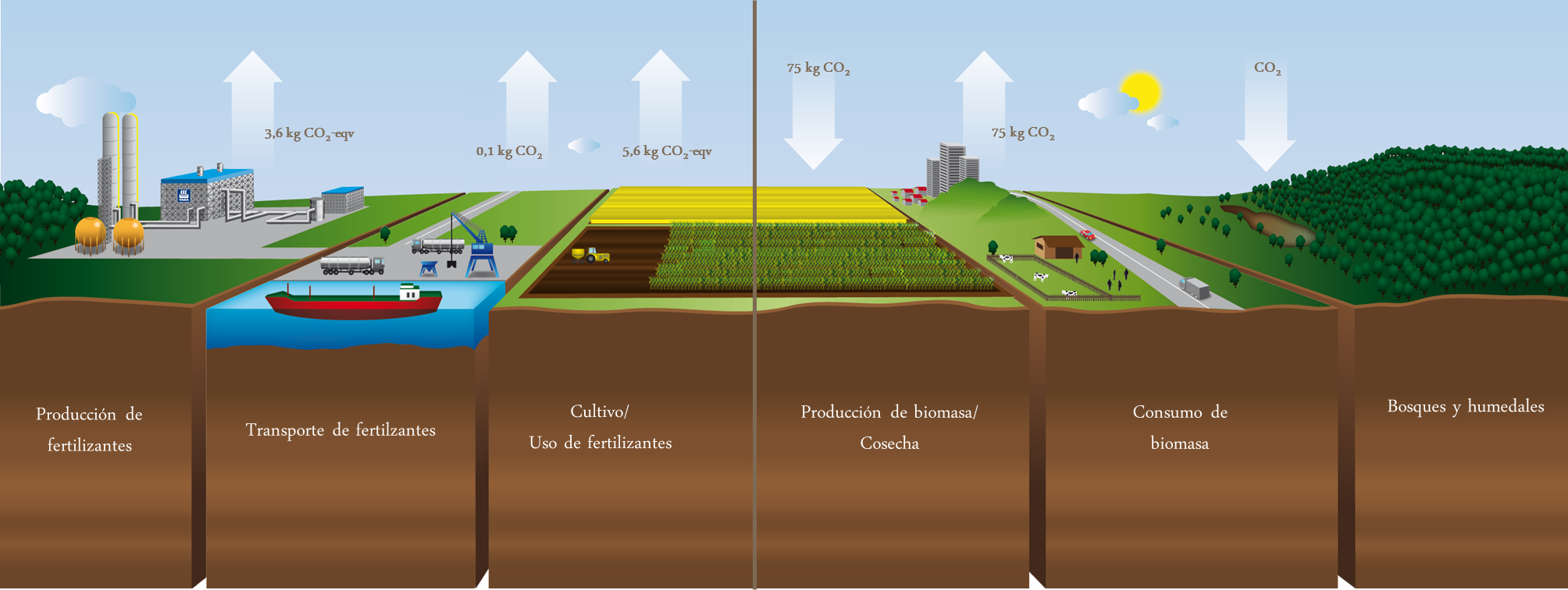 Las plantas capturan grandes cantidades de CO2 durante su crecimiento. Una fertilización óptima puede incrementar la producción de biomasa y por consiguiente la absorción de CO2 por un factor de 4-5 en comparación con campos que están sin fertilizar a largo plazo. Como ejemplo, con un rendimiento de 8 t/ha obtenido con 170 kg N/ha, los granos absorben 12,800 kg/ha de CO2. Esto corresponde a 75 kg de CO2 fijado por kg de N aplicado al cultivo.