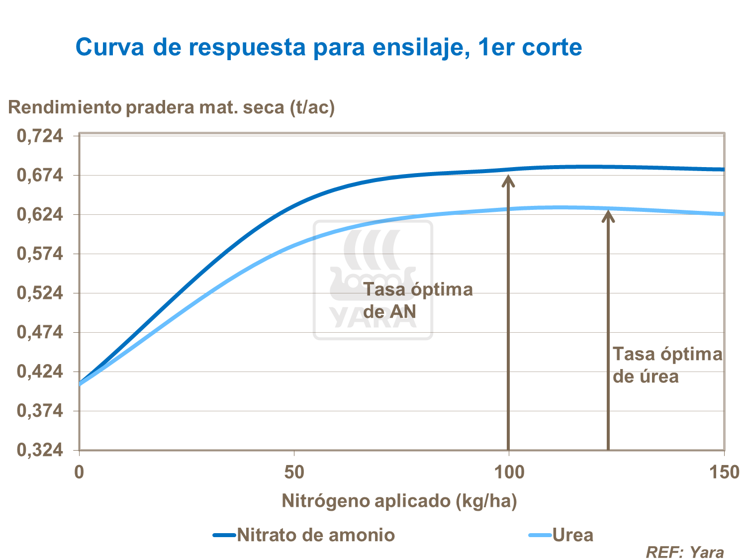Este gráfico muestra la respuesta típica de nitrógeno a aplicaciones de AN y úrea a base de ensayos de Yara conducidos durante muchos años. El óptimo actual tiende a variar dependiendo de la ubicación y el potencial de crecimiento del pasto.