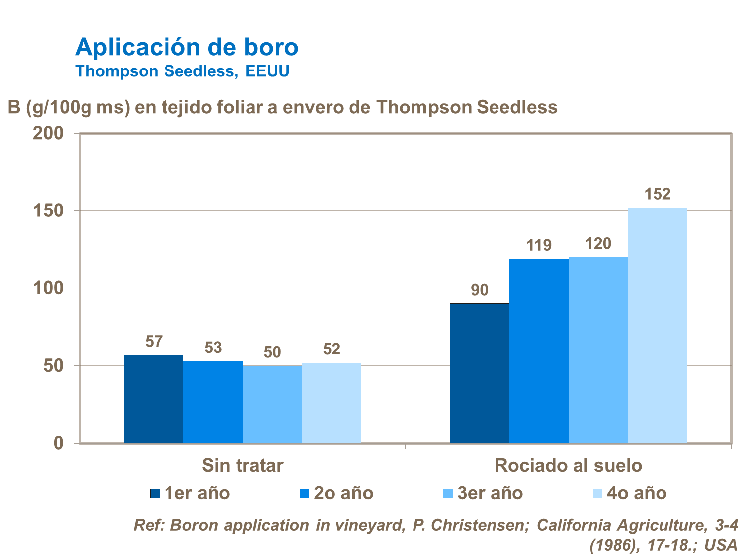 El boro juega un papel importante en el cuajado de la uva de mesa. Se absorbe con rapidez del suelo, pero se queda relativamente inmóvil en la planta. Por esto, las aplicaciones foliares antes e inmediatamente después de la floración asegurarán una polinización correcta y un racimo lleno de fruto. La deficiencia de boro puede afectar seriamente la producción de uva de mesa a causa de un menor número de racimos y con uva grandes y pequeña en el mismo racimo. Por eso, las aplicaciones de boro son esenciales para incrementar el crecimiento y la producción.