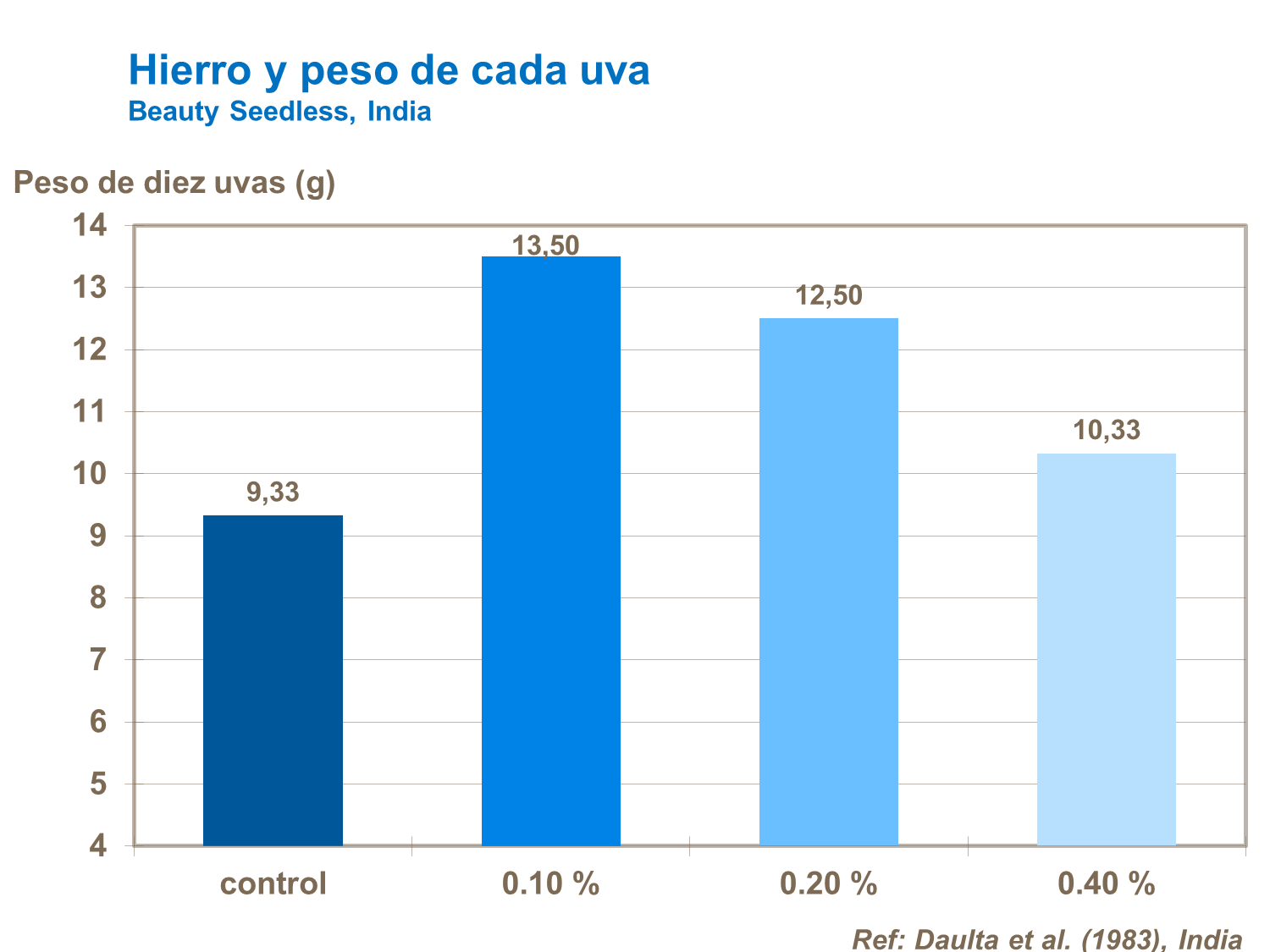 Las aplicaciones de hierro (en forma de quelato vía suelo o foliar), podrán usarse para incrementar la producción foliar temprana y la productividad de la vid. Las aplicaciones de hierro en cantidades suficientes resultaron favorables para el crecimiento y un aumento en el peso del fruto. Es importante recordar que el exceso de hierro podrá tener un efecto negativo. Los suelos con un alto contenido en hierro podrán provocar una reducción en la absorción de manganeso, un elemento que asegura un mejor desarrollo de la uva.