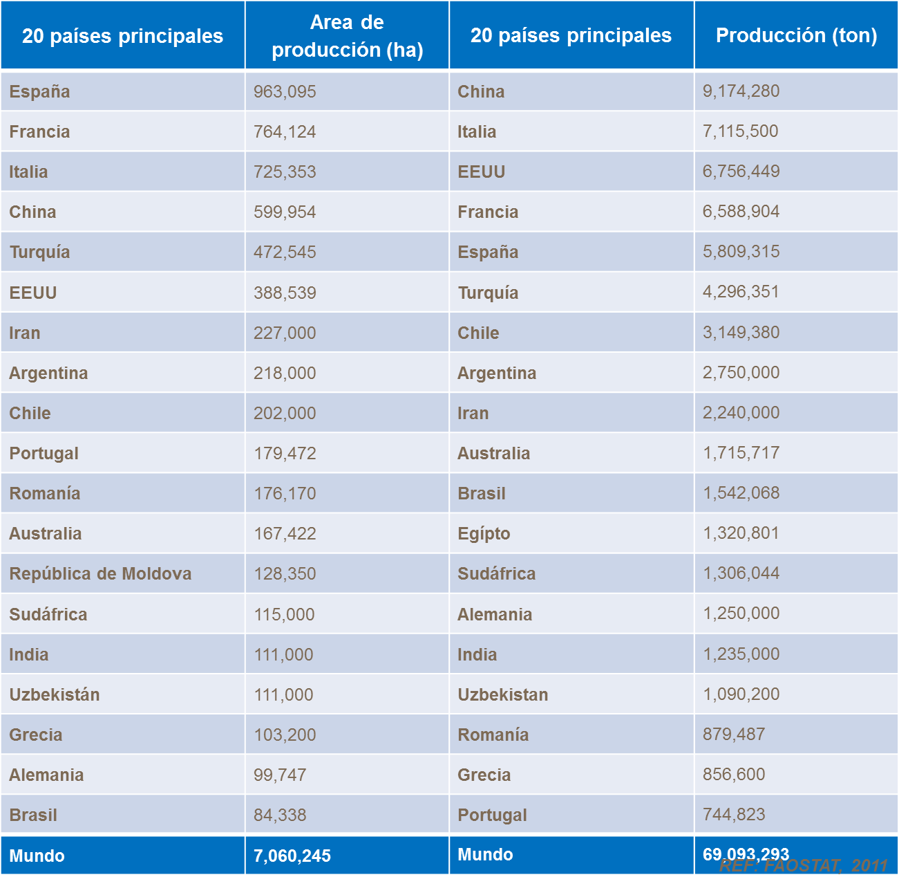 Los mayores productores de uva de mesa son China, Turquía e Italia. Estos tres, y otros países del hemisferio norte representan casi el 70 por 100 de la producción de uva de mesa. China consume casi la totalidad de los 3,8 millones de toneladas de uva de mesa que produce. Turquía e Italia son los exportadores principales hacia países europeos.