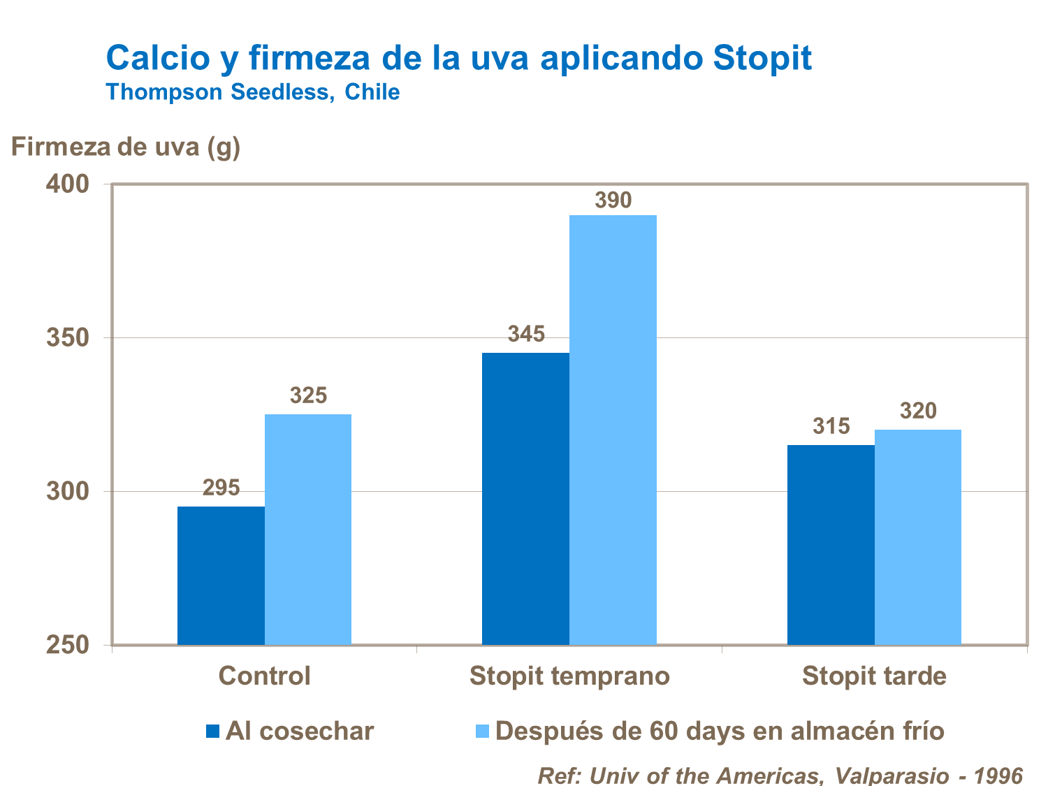 El calcio es un componente clave en las paredes celulares para mantener la estructura de las membranas. La nutrición de calcio es uno de los factores más decisivos para la calidad post cosecha de la uva. Es importante mantener niveles suficientes de calcio en la piel de la uva durante toda la temporada a través de aplicaciones o pulverizaciones dirigidas al racimo durante el desarrollo del fruto. Las pulverizaciones de calcio directo al fruto, sobre todo durante la maduración del fruto, son importantes para mejorar la resistencia de la piel. El calcio aplicado en forma de Nitrato de calcio mejora su firmeza. Aplicando calcio se mejora también la resistencia de la piel.