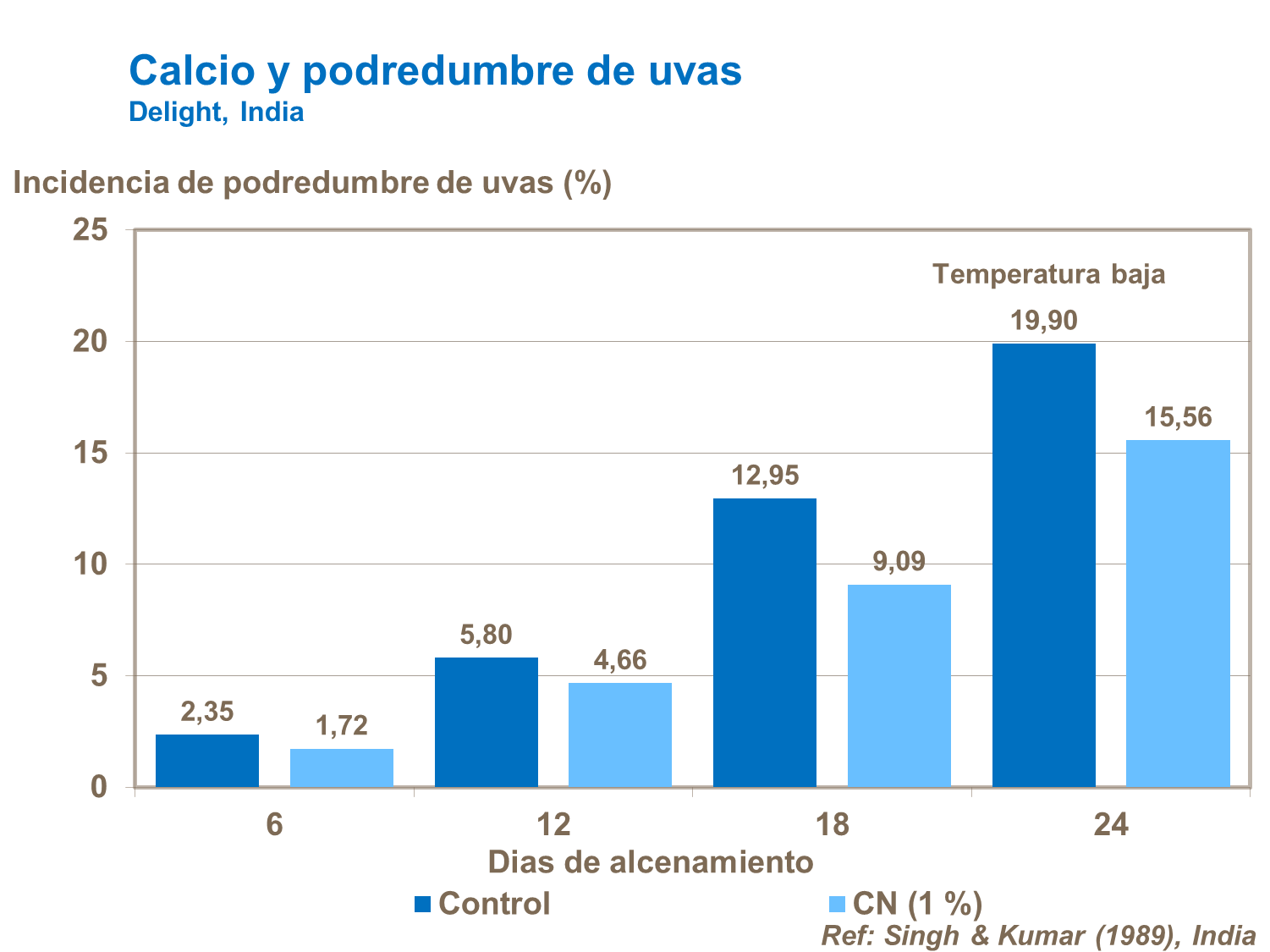 El calcio tiene una función esencial en el proceso de lignificación y maduración de la madera. Aumenta la tolerancia contra las heladas y enfermedades. Las aplicaciones de nitrato de calcio reducen la incidencia de podredumbre post cosecha y alarga su posibilidad de almacenaje.