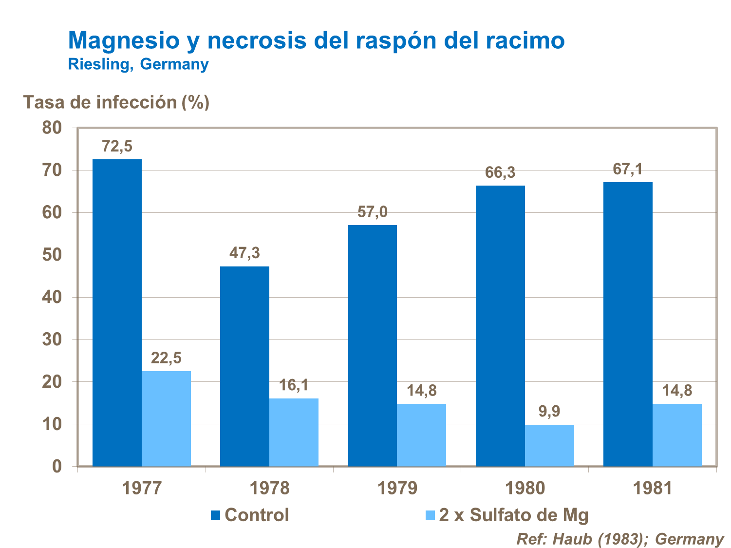 Una deficiencia de magnesio también se asocia con la necrosis del raspón. El trastorno afecta al cuajado y su maduración. De dos a tres aplicaciones foliares de magnesio empezando justo antes del envero reducirán el problema. La necrosis del raspón también se asocia con un desequilibrio entre magnesio y potasio/nitrógeno. Existen estudios que muestran que con niveles bajos de azúcares en los órganos de almacenaje y en la uva, llevan a una acumulación de nitrógeno, particularmente durante periodos de clima frío en el momento de la maduración. En ese momento, las pulverizaciones de magnesio pueden ayudar en reducir la necrosis del raspón.