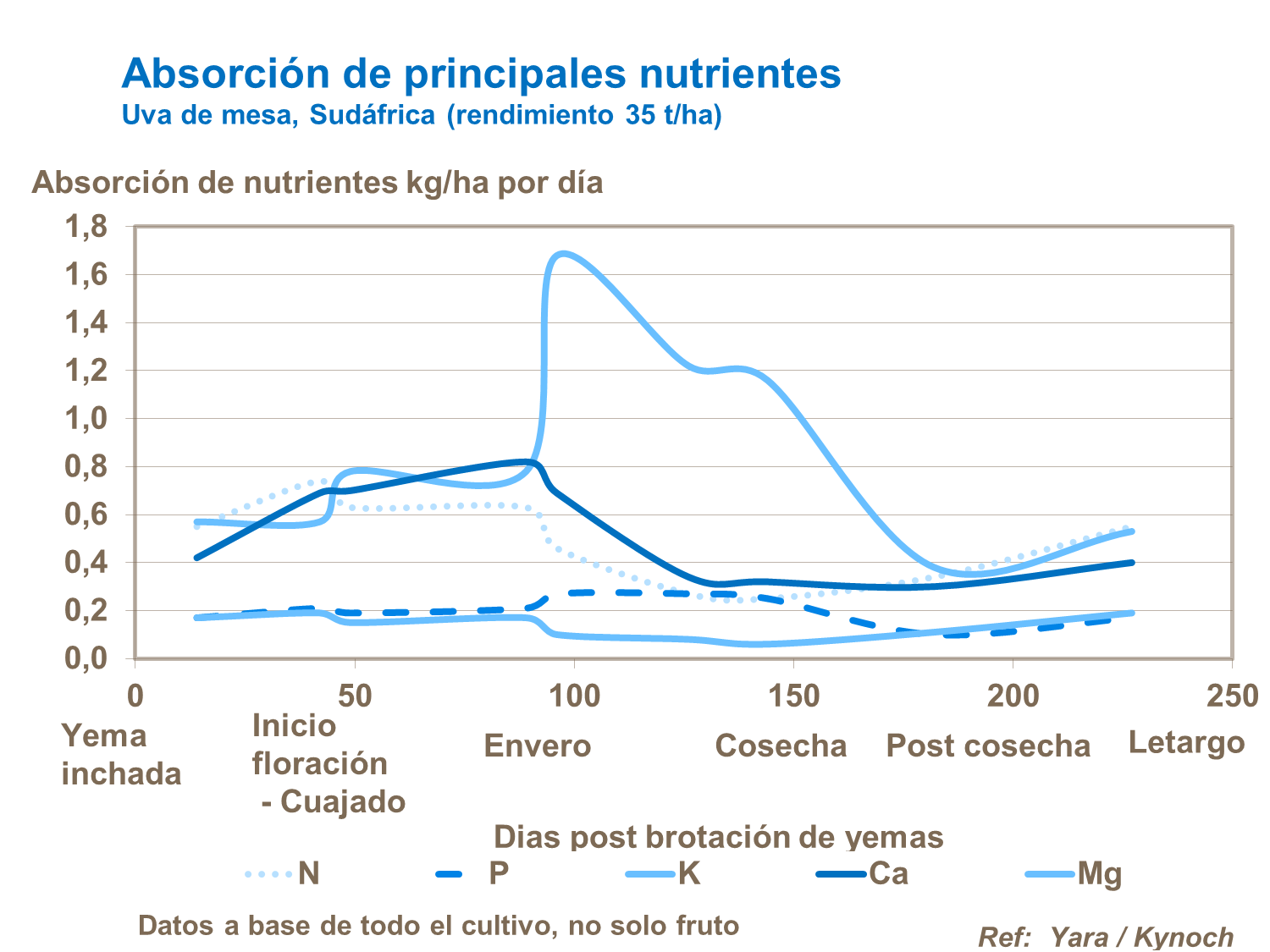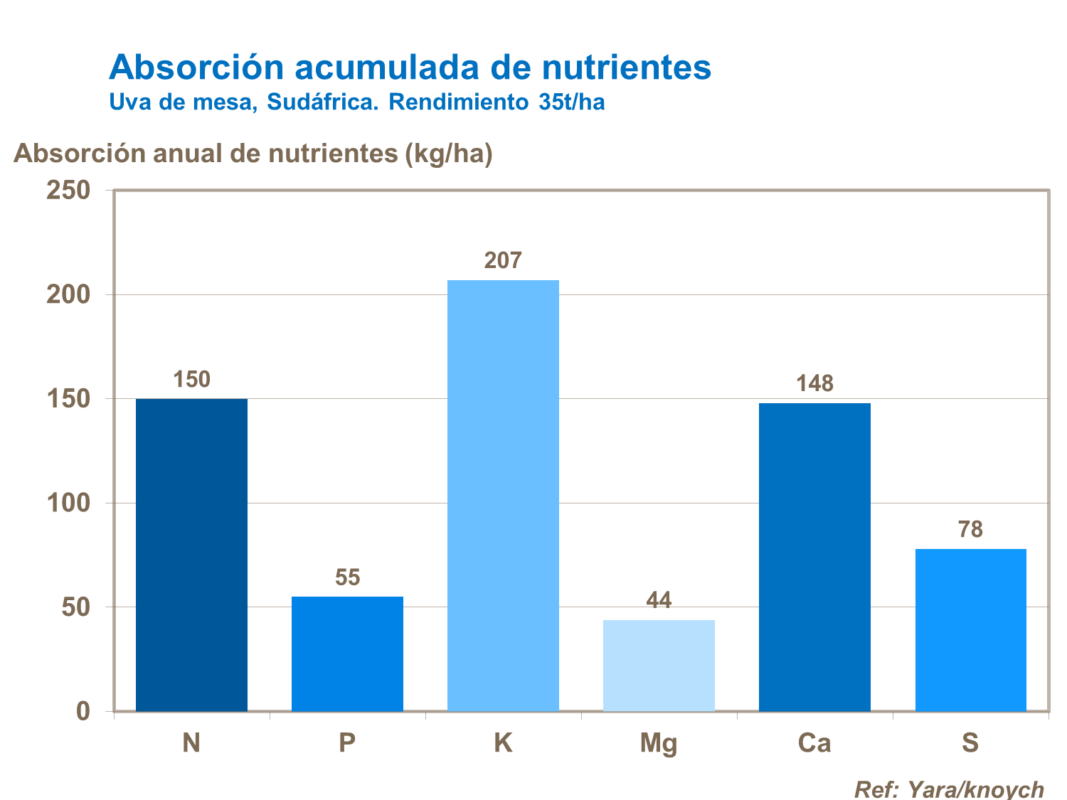 Aplicaciones tempranas de nitrato de calcio pueden suministrar las necesidades de ambos nutrientes, para un desarrollo vigoroso de raíces y la producción de hojas nuevas. Sin embargo, pulverizaciones de calcio directas a la uva, especialmente avanzada la campaña, son importantes para mejorar la resistencia de la piel, y la resistencia a la manipulación y el almacenamiento.